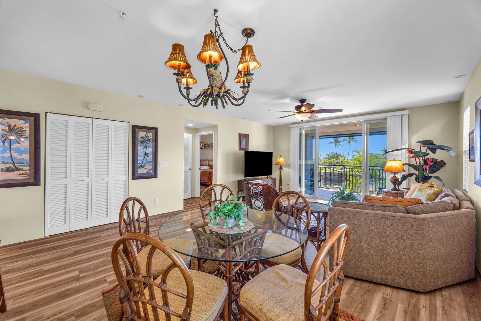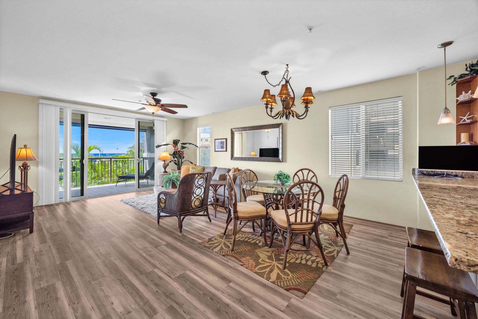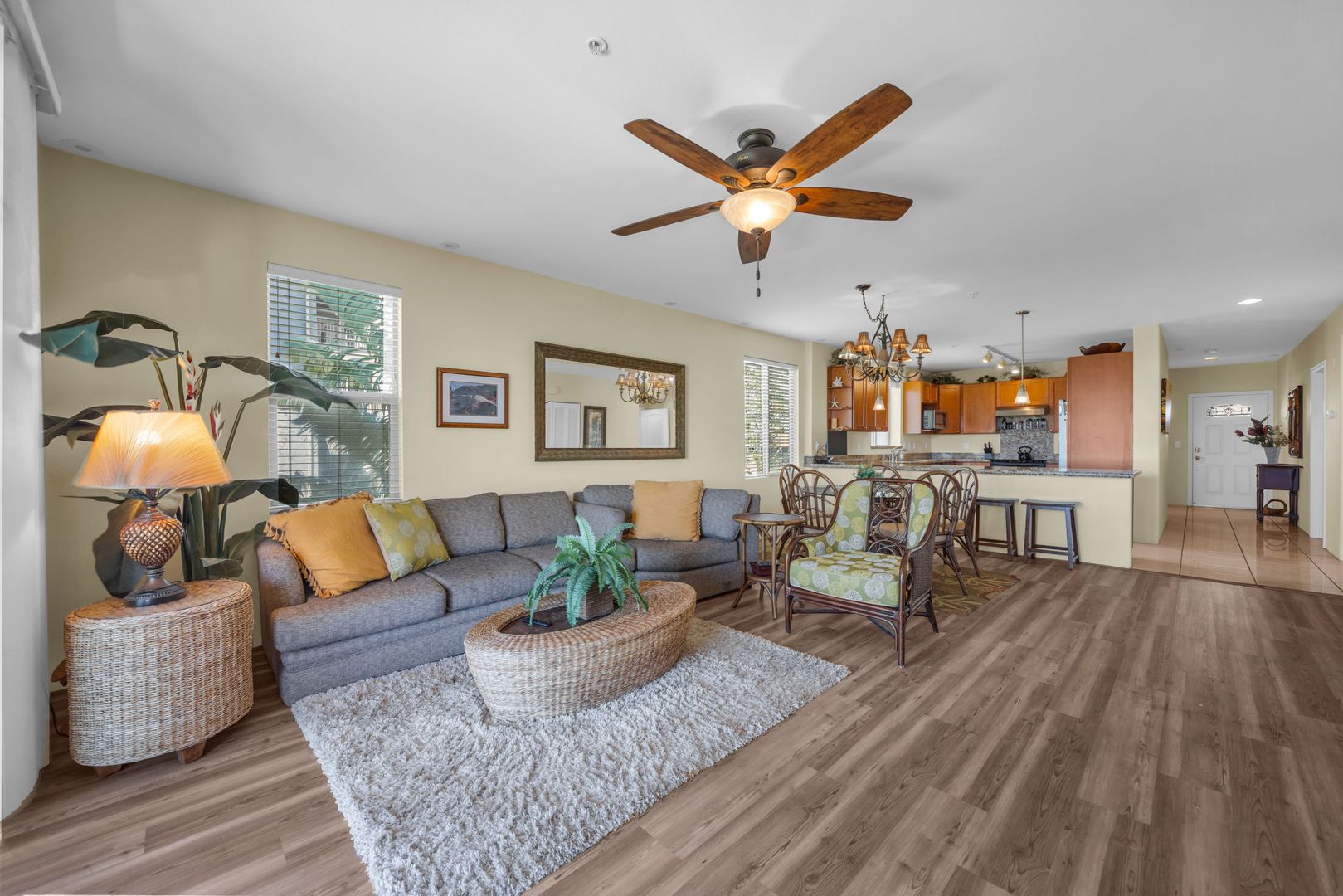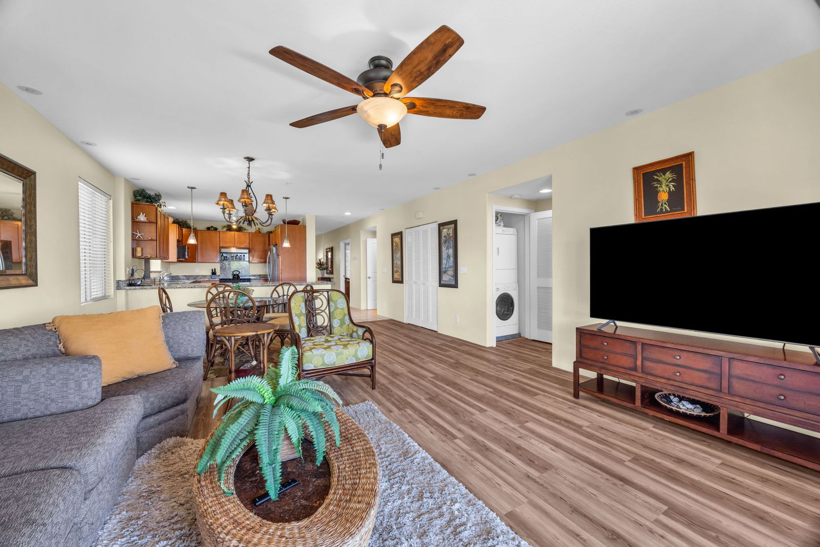 The unit features an open-concept layout with tile and PVL flooring throughout, offering a clean, modern feel and easy maintenance. The well-equipped kitchen includes a dishwasher, microwave, oven, refrigerator, and garbage disposal. Stay cool year-round with central A/C and ceiling fans, and enjoy the convenience of in-unit laundry. Use your private lanai to relax and unwind and the end of a long day.